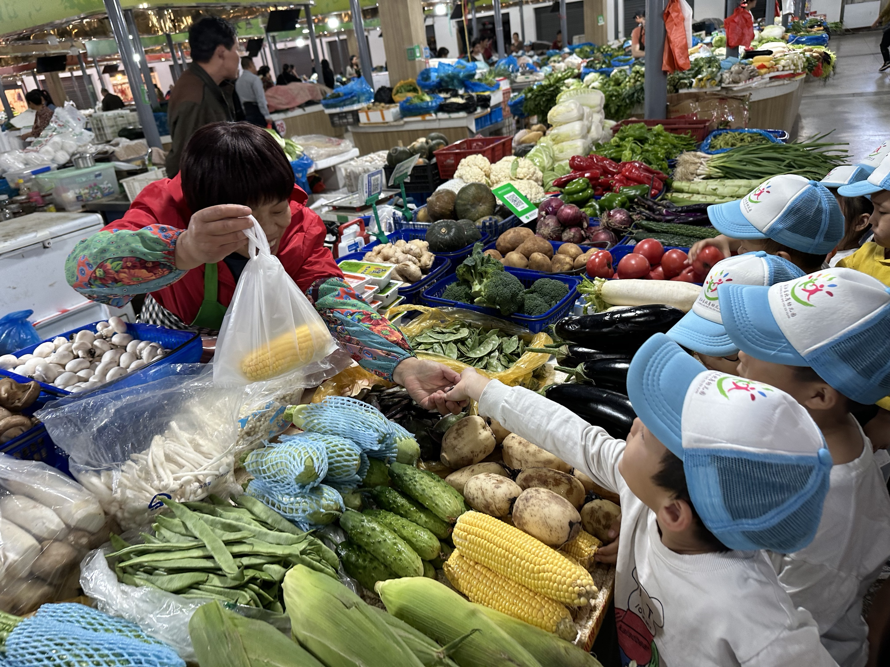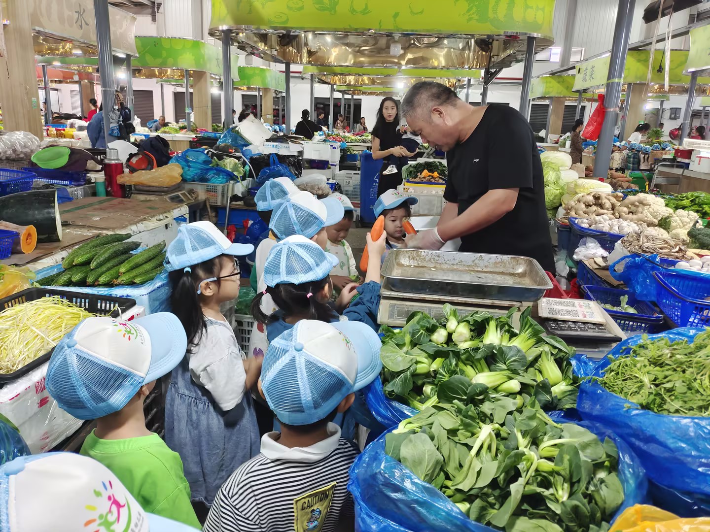秋天藏身的地方有很多,也许是田间地头那一眼望不到边的谷穗,也许是树梢旁如黄蝶飞舞般的落叶,它就如同一把金贵的钥匙,打开了丰收的大门,而存放秋天成果最多的,无疑是生活中那必不可少的地方——菜场。我们中班组的孩子在老师的带领下徒步去菜场,在一路的欢歌笑语中,菜市场很快就到了。看到货台上琳琅满目的物品,孩子们看得应接不暇。水产区有鲜活的鱼、虾、螃蟹;蔬菜区放着很多平时常吃的菜品:青菜、土豆、黄瓜、西红柿,看过去新鲜又诱人;水果区传来的阵阵果香,让人忍不住吸上几口,摸一摸它的形状、说一说它的颜色、闻一闻它的气味,真是让人垂涎欲滴。