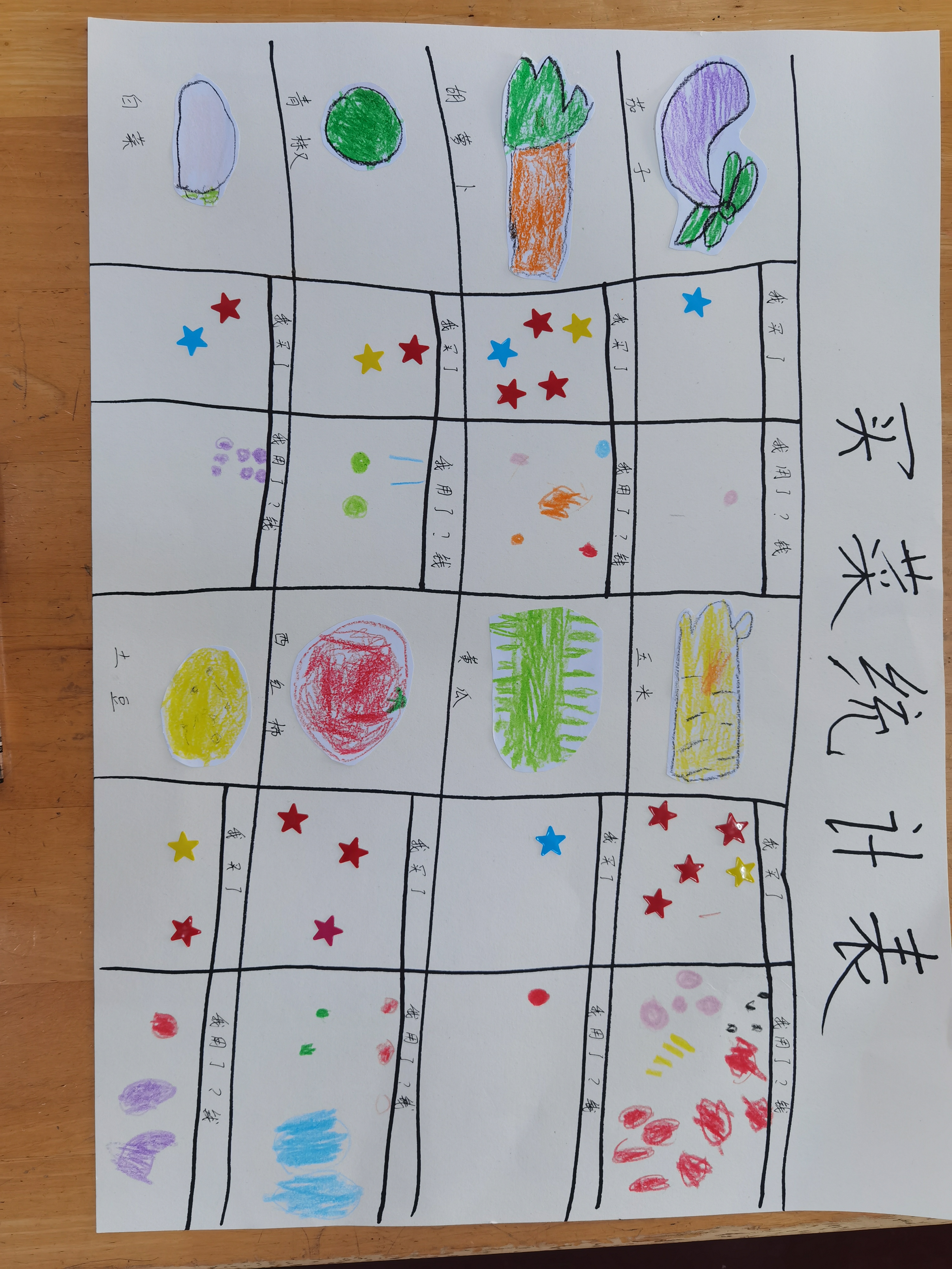 回到班级后,孩子们聚在一起,三三两两的分享着买菜的趣事儿。我们还进行了买菜统计表。