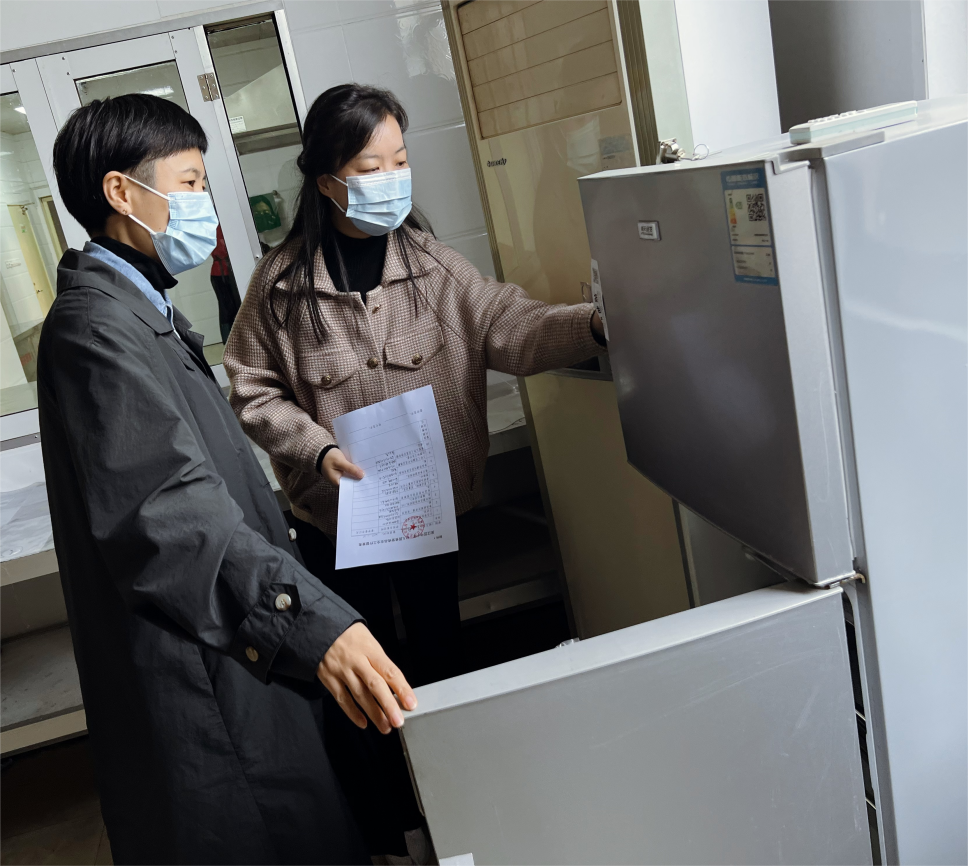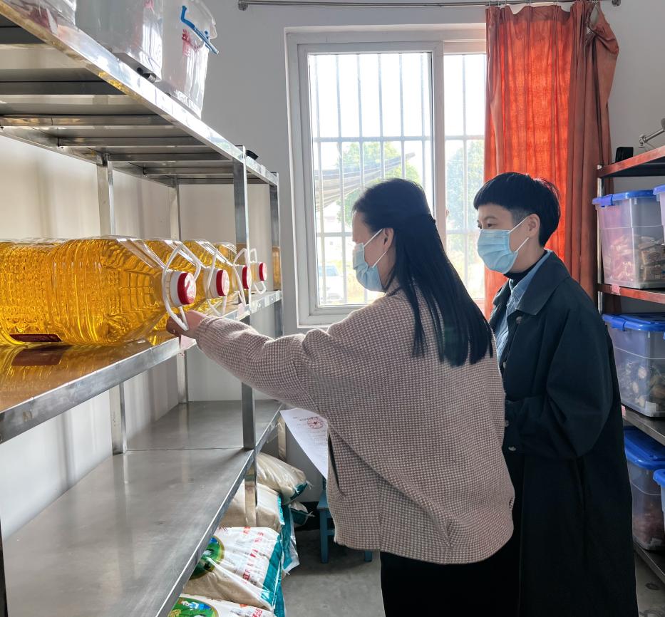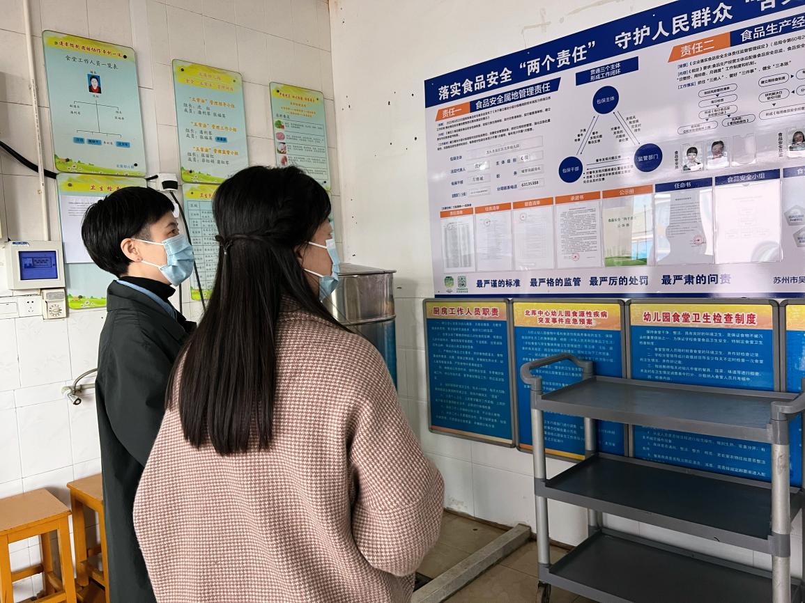 在徐晓华副园长的的陪同下,督导深入幼儿园食堂内部,对食堂工作人员健康管理、落实食品安全管理制度、食品配送和检测、食材分类加工环节、食品留样和记录、食品储藏等情况进行了询问和查看。