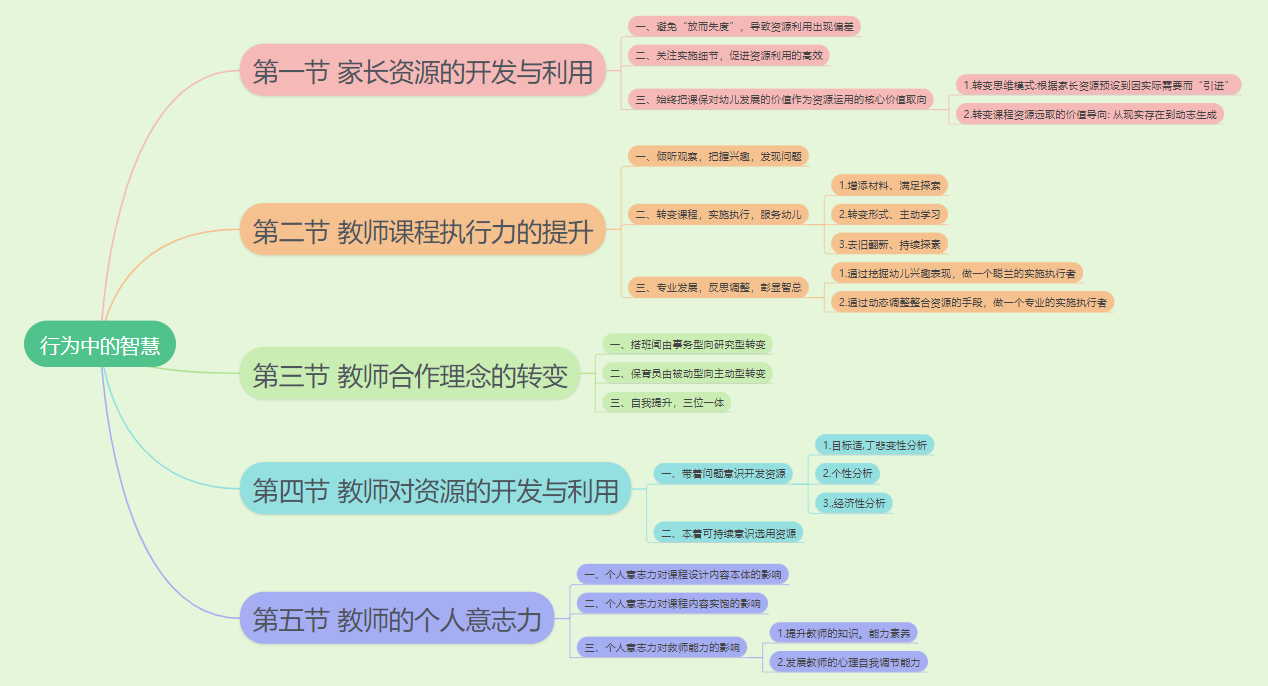 赵红:一切可能的课程资源都具有潜在价值,多种多样的课程资源为班本课程的实施提供了广阔的空间,这也要求教师必须能掌握课程资源,使自己不但能够选择出最合适的资源,也能决定最适合的时机、场所以及方式让幼儿去利用这些资源,这是教师实施执行力提升的重要途径之一。(P105)