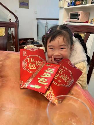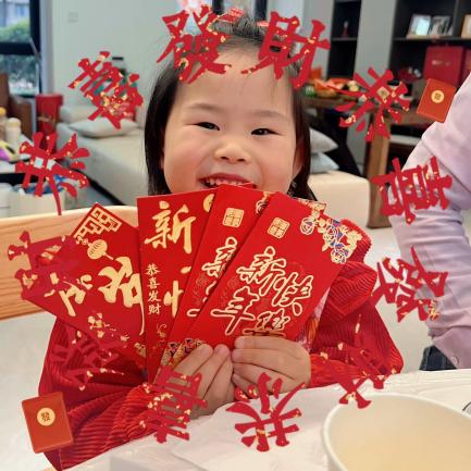 新春过年给红包,俗称红包压岁。据说压岁钱可以压住邪祟,因为“岁”与“祟”谐音,晚辈得到压岁钱就可以平平安安度过一岁。瞧!孩子们拿到压岁钱多开心呀。