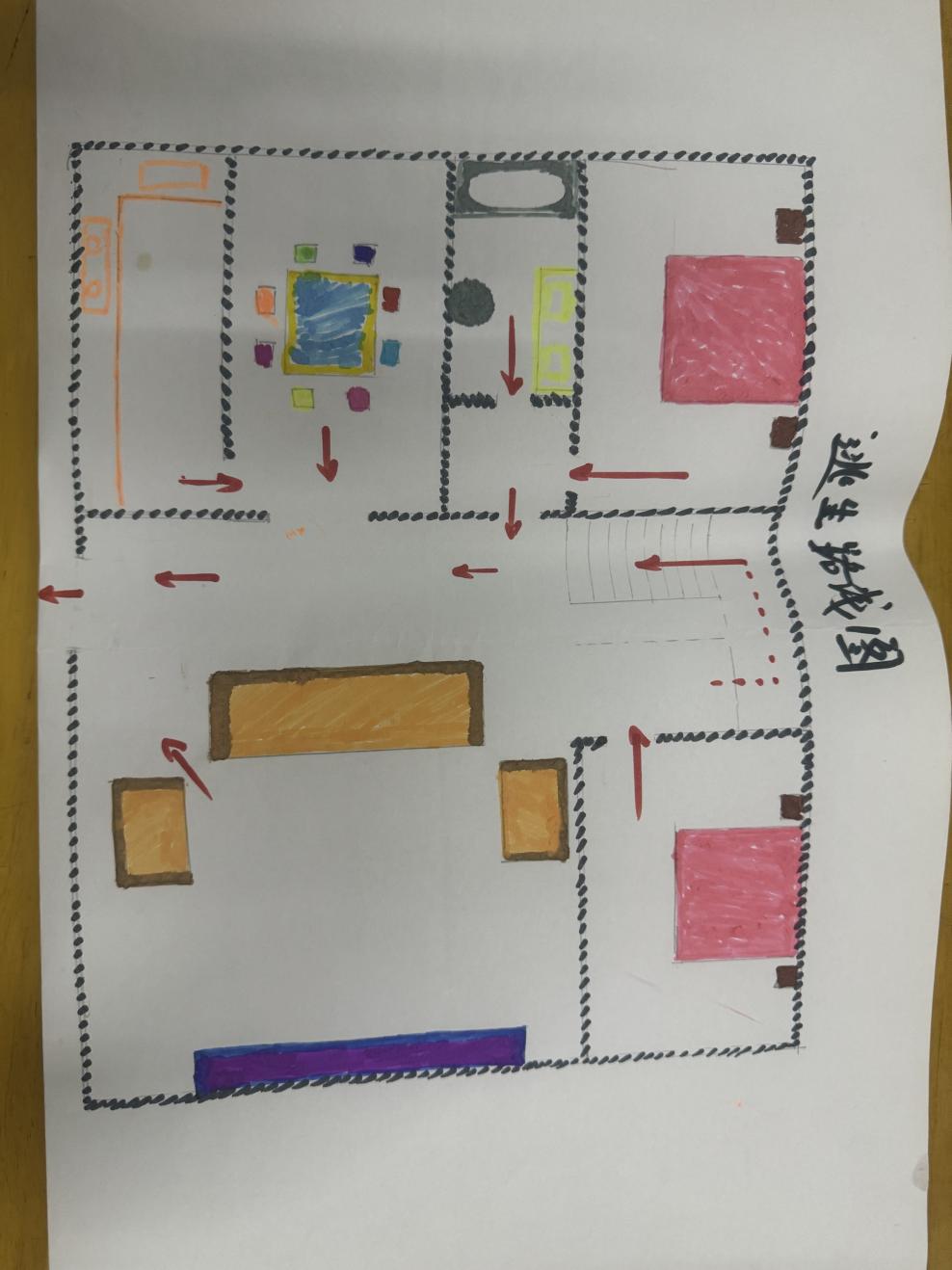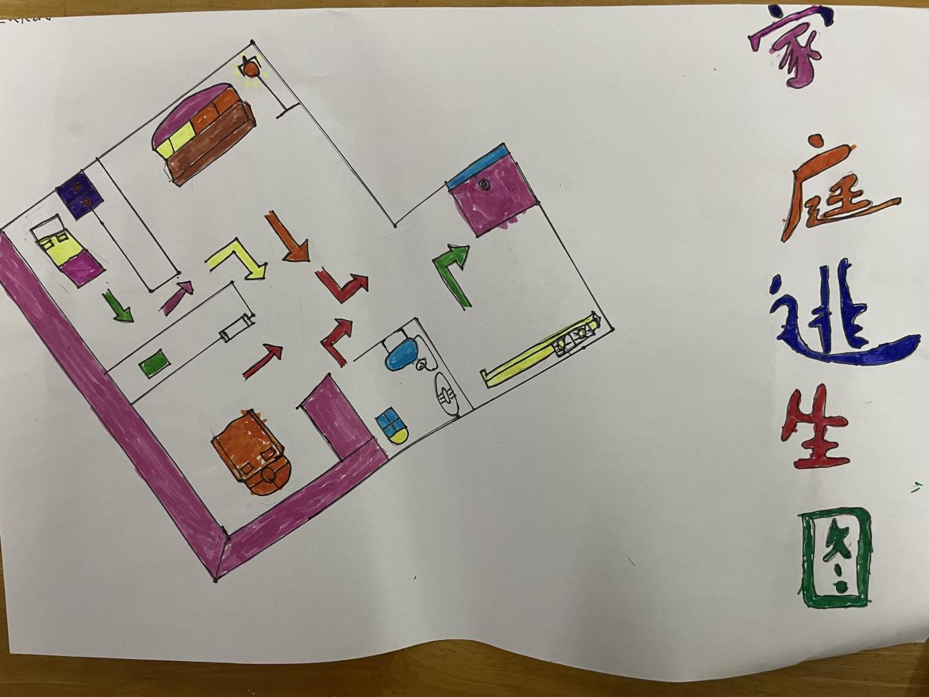 小朋友和家长根据自家的楼层特点找到了不同的逃生出口及消防设备,化身“绘图能手”,绘制出家庭紧急逃生疏散路线图。
