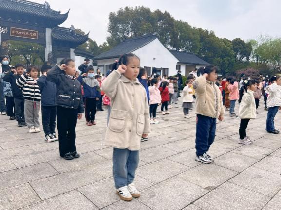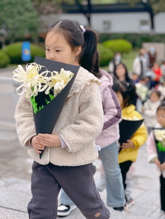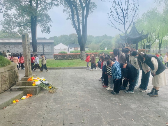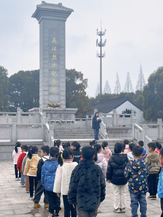 随后,孩子们在老师的带领下,排着整齐的队伍,迈着沉重的步伐,向吴江烈士陵园出发了。鲜花献英雄,孩子们整齐列队,将亲手制作的花朵献给烈士们,朵朵小花承载着对烈士的无限哀思和悼念,唯有以这诚挚之心,致敬、告慰烈士忠魂。