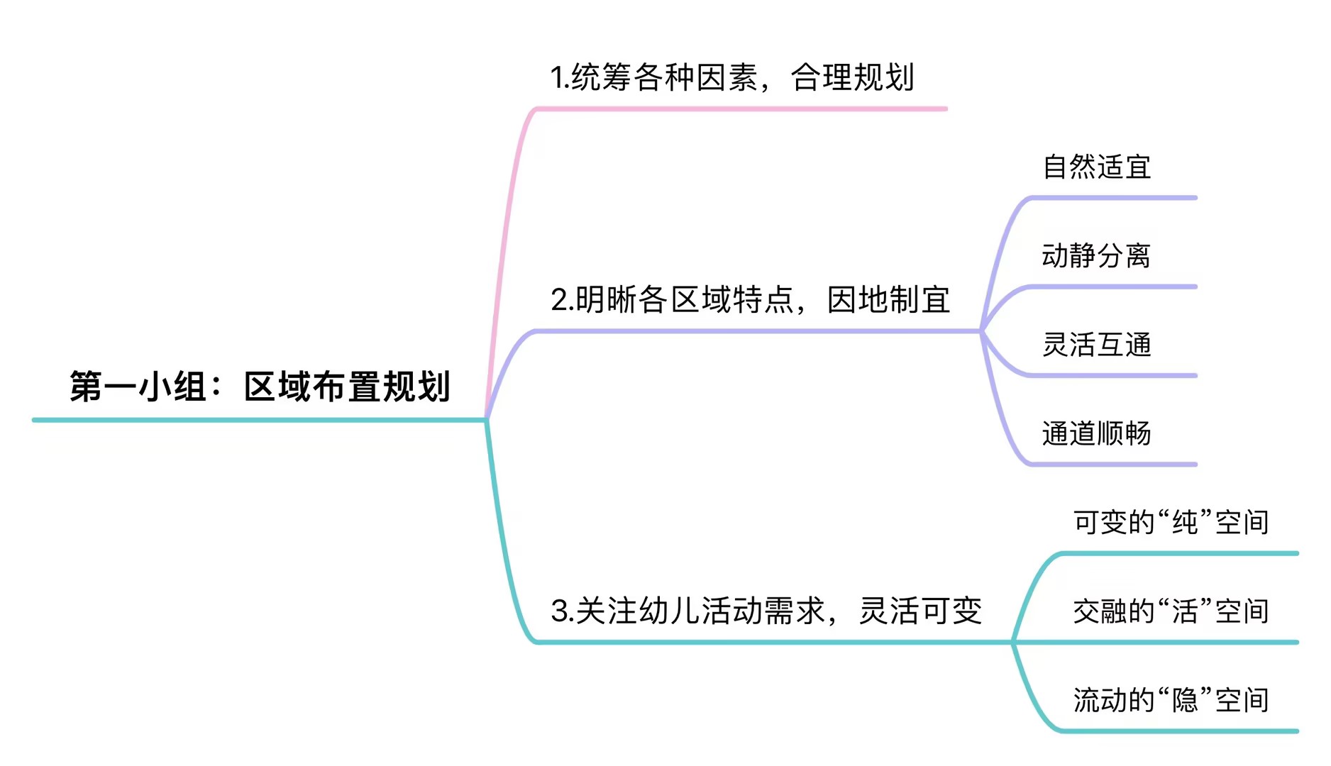 老师们分组进行交流,分别探讨了从以下几个方面来规划能引发幼儿探究的学习环境: