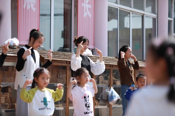 伴随着欢快的音乐,孩子们邀请爸爸妈妈们加入到户外锻炼中,孩子们充满自信、劲头十足,化身小小老师,带领着家长们整齐划一地做着律动,舞动的小手,摇摆的身体,俨然是春日里最美的景。