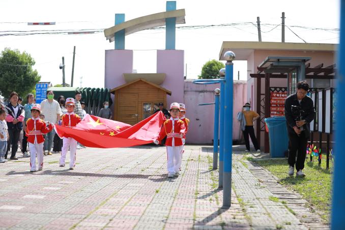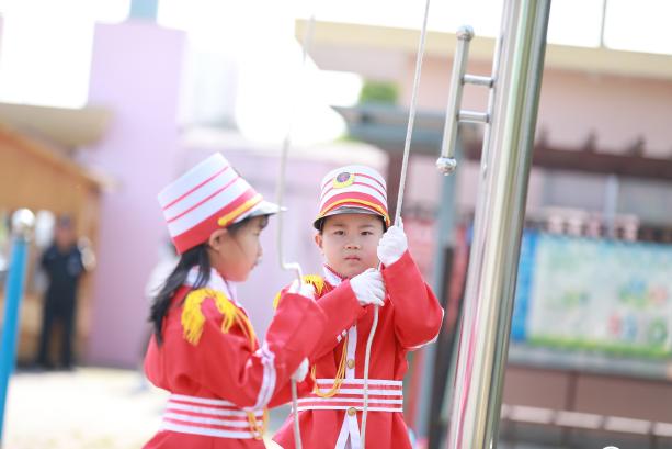 大班哥哥姐姐们着升旗装,伴随出旗音乐,小旗手们昂首阔步,精神饱满地守卫着五星红旗入场。国歌响起,鲜艳的五星红旗冉冉升起,全体师生面向国旗,行注目礼,激发了幼儿爱国情怀。