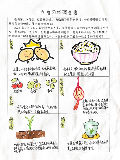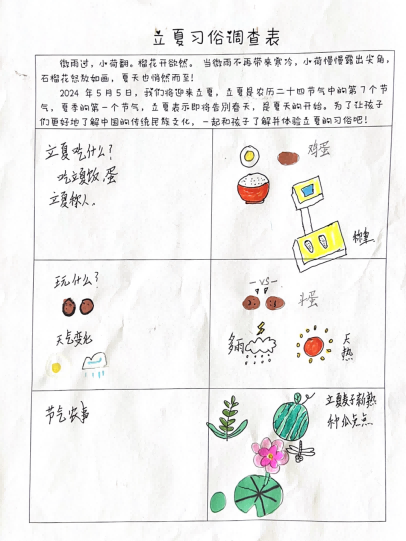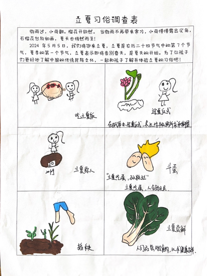 就这样孩子们你一言我一语兴致勃勃地聊起了立夏,越来越多的孩子参与到他们的讨论中,那么立夏这个节气还有哪些习俗呢?我们对此进行了一次亲子立夏习俗大调查。