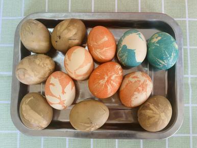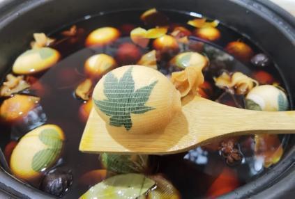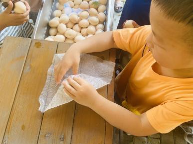 孩子们将花草蛋包扎好后,将调料和蛋一起慢火炖煮,美味等待中......