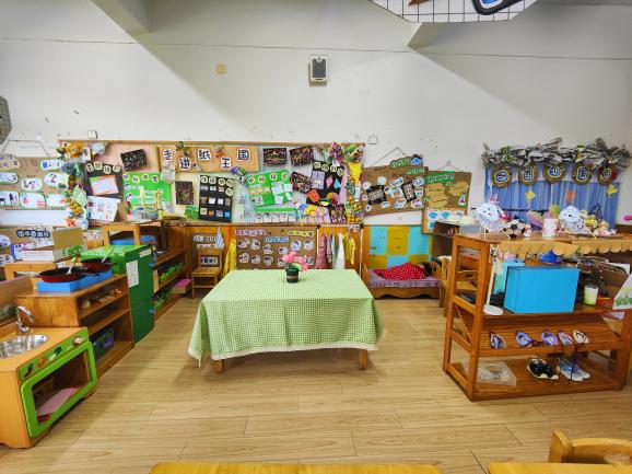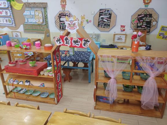 本部小三班:我们班由于场地受限,将角色区设置在了小教室,主要分为两个娃娃家,一个在进门左侧,一个在右侧,相距仅仅一条过道,是邻居,左侧稍小,右侧稍大,且光线较好。两个娃娃家的材料投放大体上相似,家中常用物品都有,比如婴儿使用的奶瓶、奶粉,各类厨房器具,并且在厨房投入了较多的食材玩具,尽可能地模拟现实厨房。最近幼儿有过生日的生活经验,进行角色游戏的时候特别喜欢举行生日聚餐丰富了游戏情节。