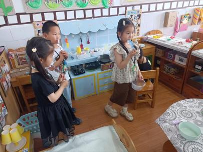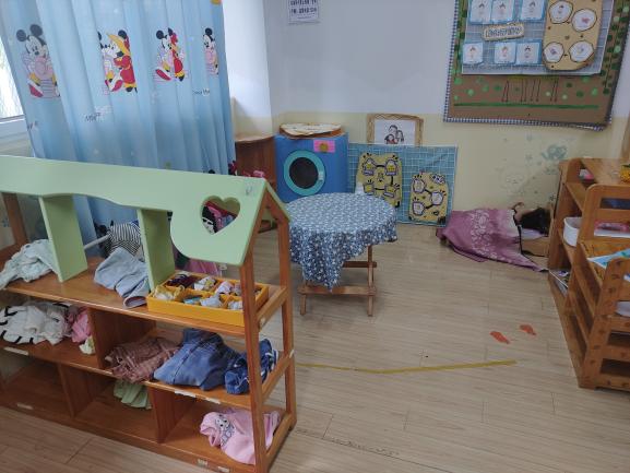 黎星中二班:我班娃娃家位于教室内的拐角处。娃娃家分为厨房,卧室,客厅三个部分。形成了“一区多玩”的区域格局,孩子们可以在娃娃家给宝宝做饭,哄宝宝睡觉,在客厅看电视等。本学期,我们将生活区与娃娃家相融合,将原本生活区中的串珠子、牙刷等材料放入娃娃家,幼儿可以进行串项链给娃娃佩戴。给娃娃刷牙、叠被子等。将生活区与娃娃家融合后,娃娃家的游戏内容和情节更加丰富了