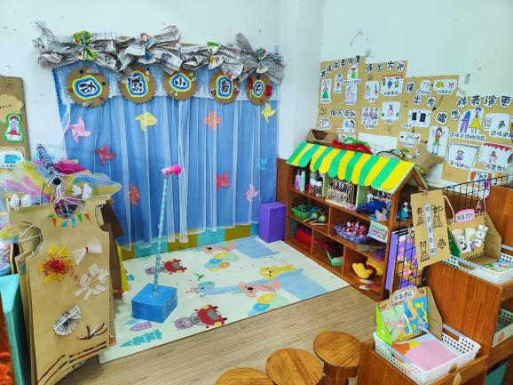 新鹤中三班:我们将较为封闭式的娃娃家改成了半封闭式的,便于幼儿与其他区域的联动游戏。相对之前的娃娃家,我们进行了分区,一半作为厨房和餐厅,新增了冰箱与烤箱,并在材料柜上放置了与目前“走进纸王国”的各类纸材料,供幼儿游戏。另一半是房间,靠墙放置了小床、衣架,新增了衣橱和洗衣机,供幼儿进行洗衣晾晒,以及折叠衣服收纳整理。小舞台的位置从靠窗的西南角移到了西北角,在墙面上增加了一些演出的注意事项以及演出方式的展板,在“纸王国”的主题下,投放了纸质服装,材料架上放置了各类游戏道具,话筒,首饰,帽子等,材料架边上的网格用于夹放发卡、头箍,眼镜等。