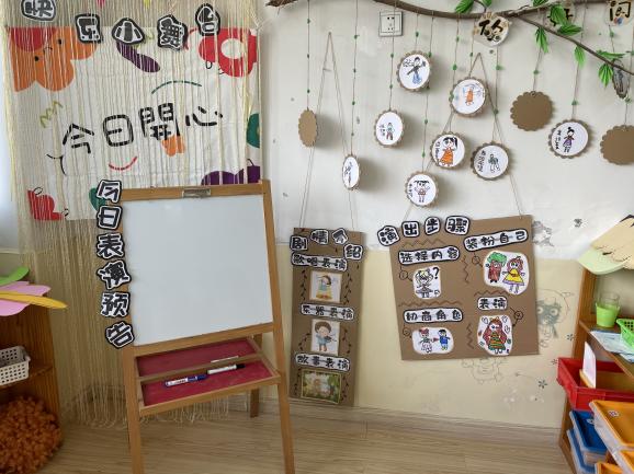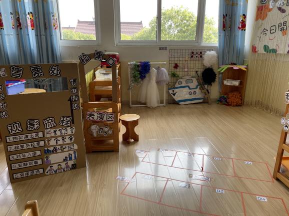 新鹤大三班:我们班的表演区设置在教室西南角的靠窗位置,用一块银丝帘和可爱幕布作为背景,环境宽敞明亮。区域内各类规则采用了图文结合的方式,让幼儿自己共同参与讨论制定规则,并主动遵守。围绕舞台区设置了观众席,采用门票制,观众根据门票对号入座。表演活动需要一定的材料支持才能显得更生动,我将表演区材料分为了头饰区、乐器区、道具区三大区。根据主题,投入的材料也会有相对变化、增减,幼儿能围绕主题创造性地使用材料布置场景、装扮自己,用道具辅助自己的表演活动。