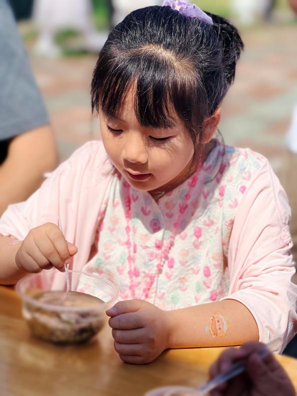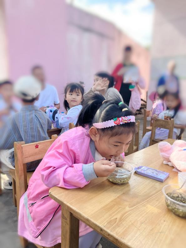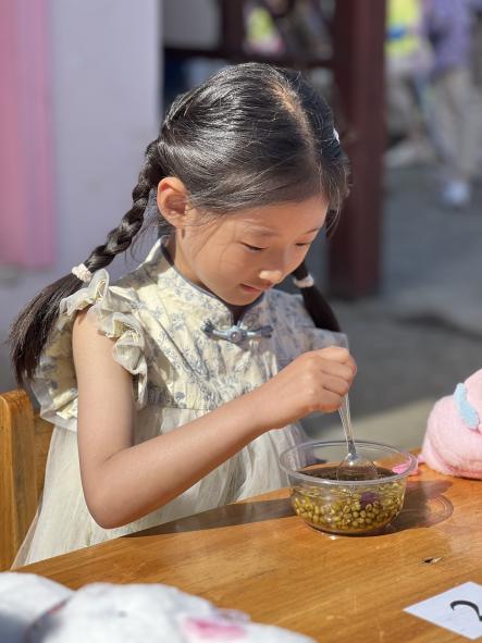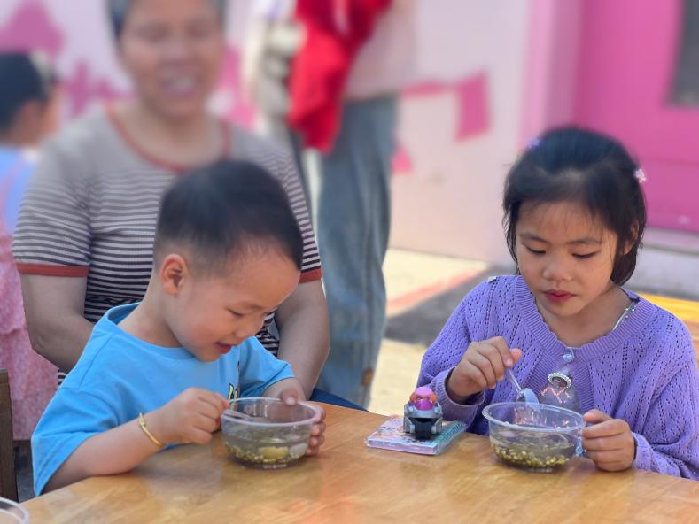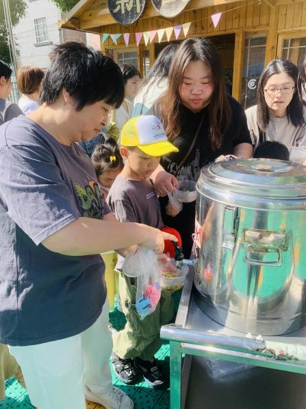 活动累了,还有清清凉凉的绿豆汤来补充能量。瞧!孩子们轻轻地抿上那么一口,小脸上顿时洋溢着满足感,瞬间又充满活力。“奶奶,你也尝尝看”“妈妈,你也喝一碗”……小小的绿豆汤为跳蚤活动增添了一抹别样的温馨色彩。