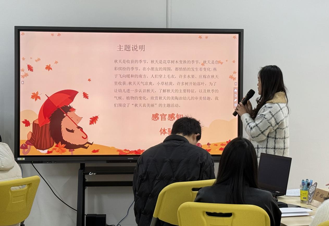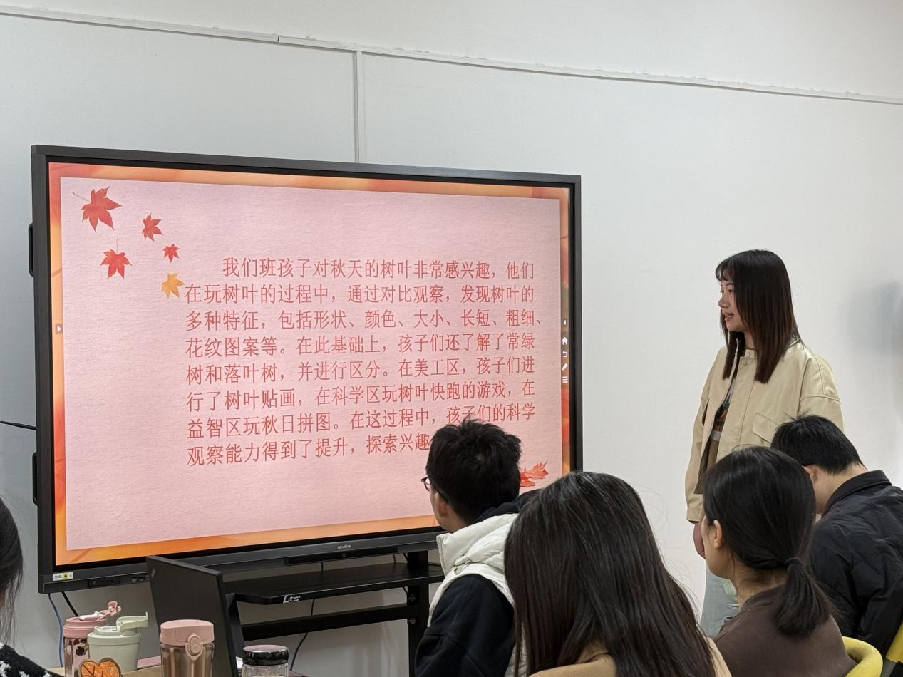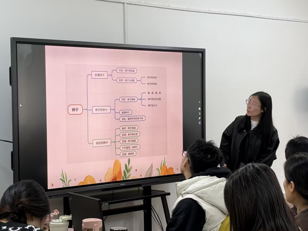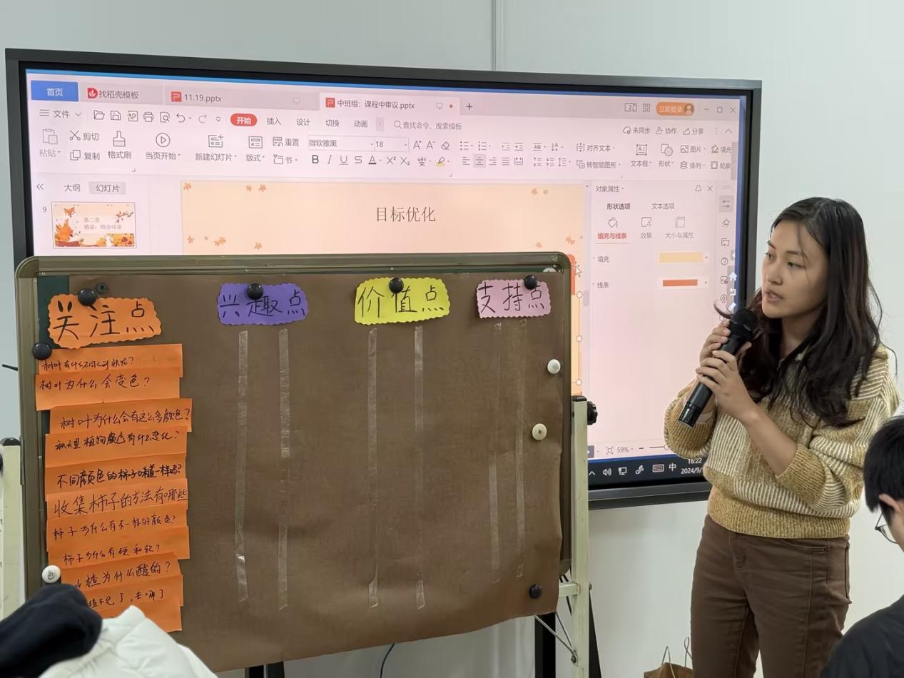 中班老师分别从课程的设计思路、课程目标、主题网络图、幼儿兴趣和挑战等方面,围绕秋叶、山楂、桔子、柿子等自然资源开展的课程案例分享了本班主题实施中的思与行。