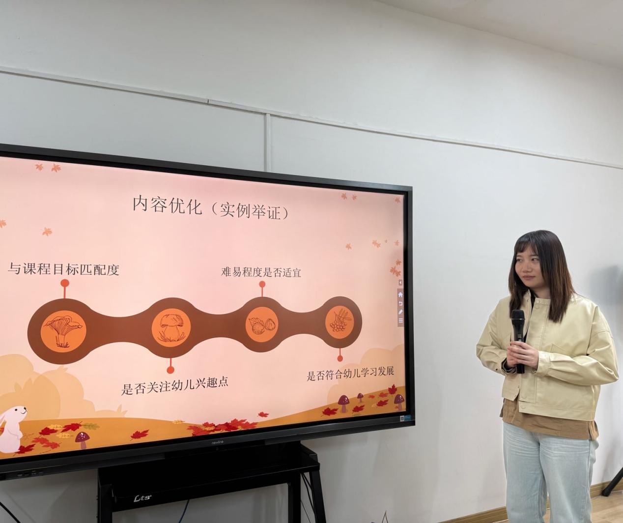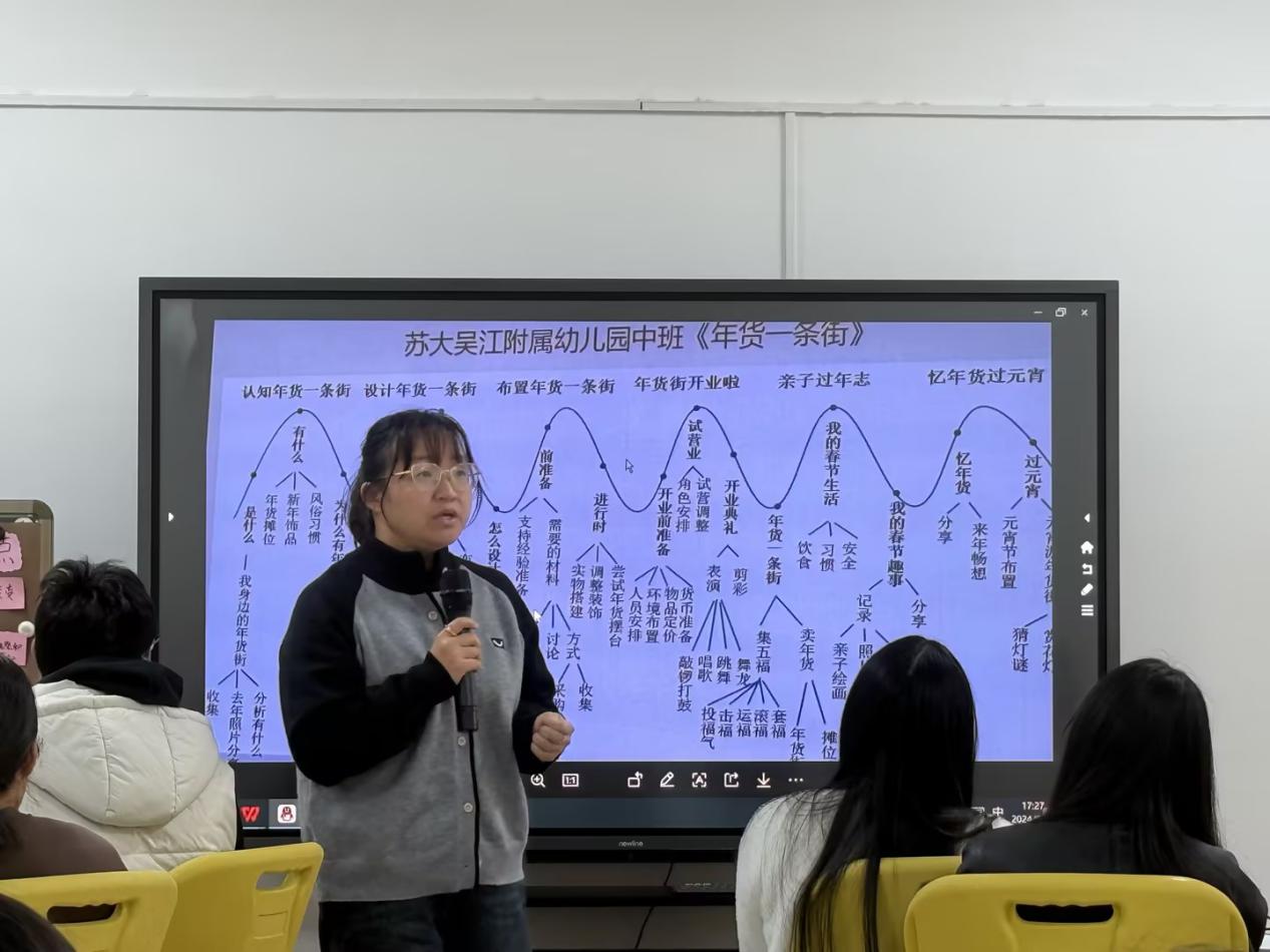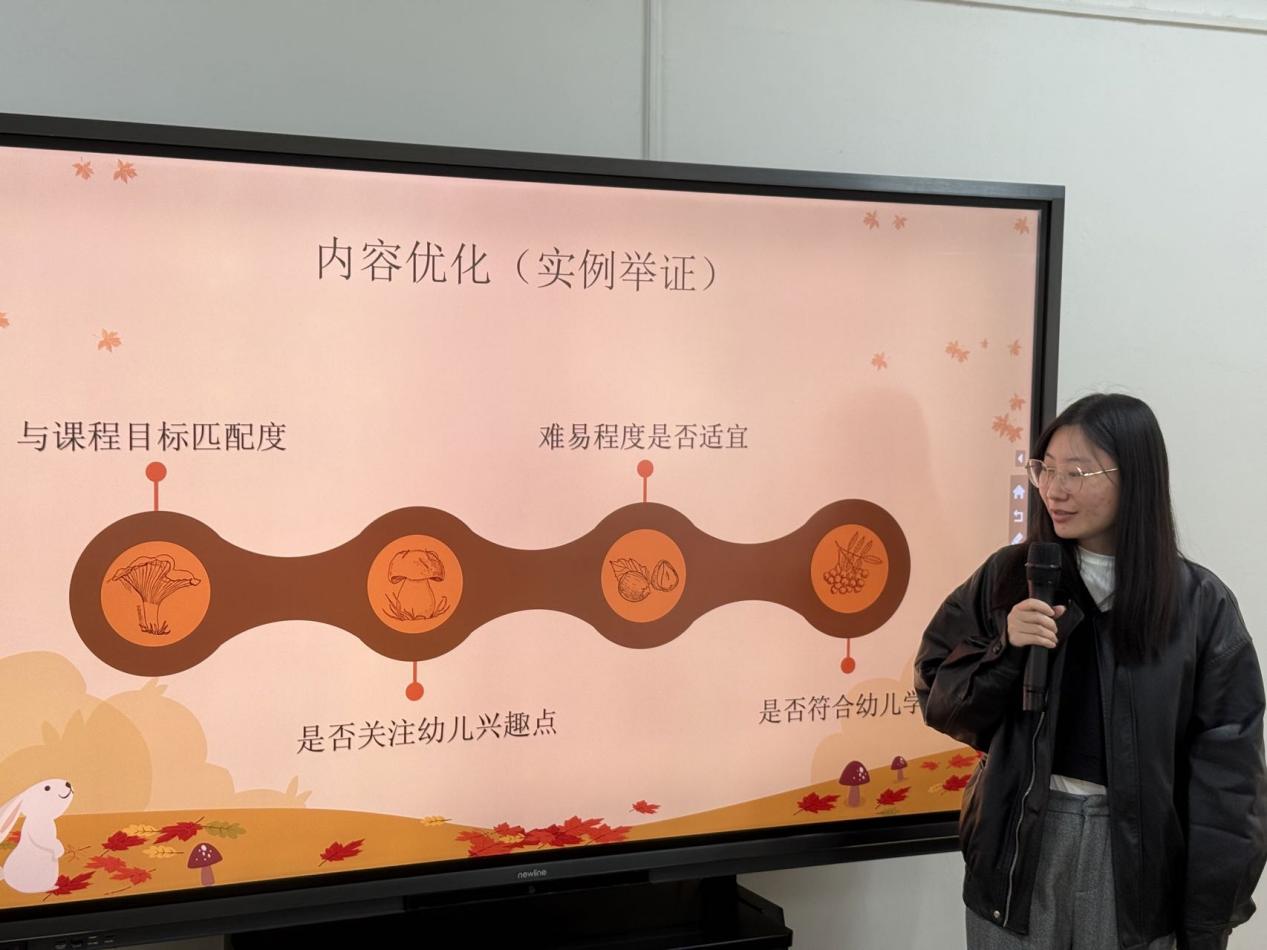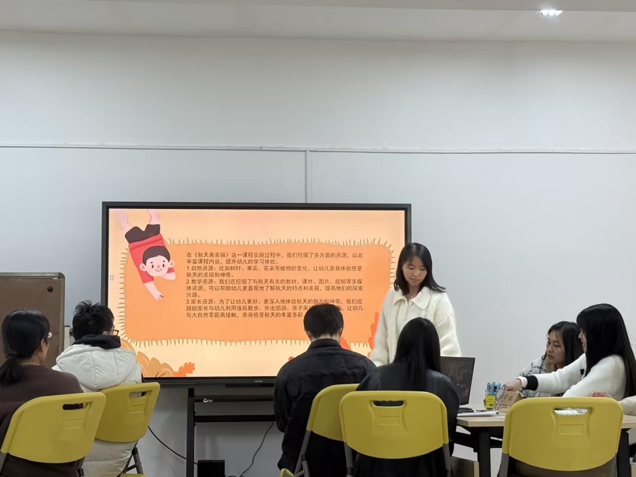 中班老师分别从课程的设计思路、课程目标、主题网络图、幼儿兴趣和挑战等方面,围绕秋叶、山楂、桔子、柿子等自然资源开展的课程案例分享了本班主题实施中的思与行。