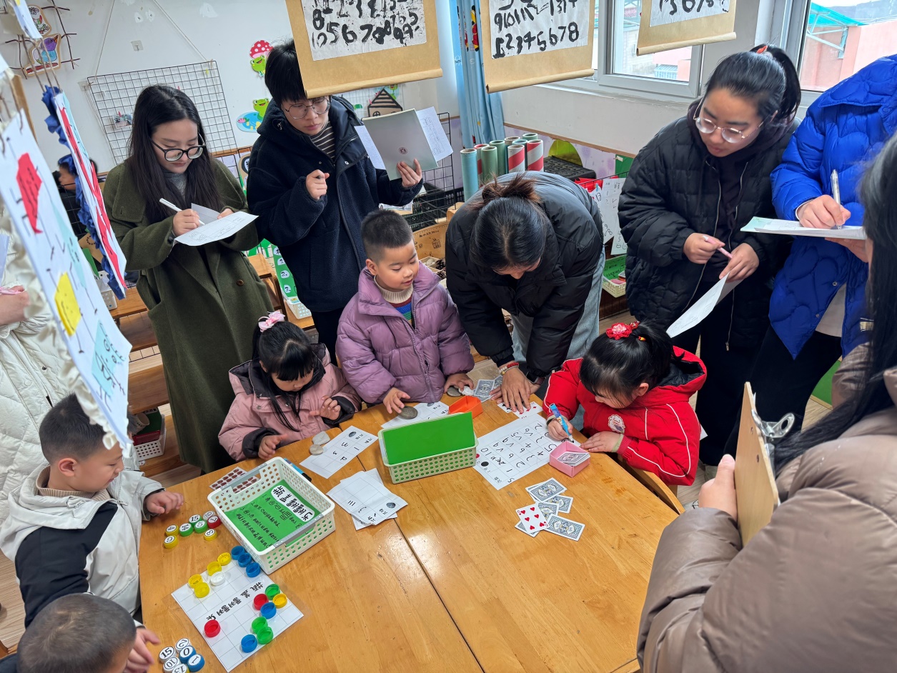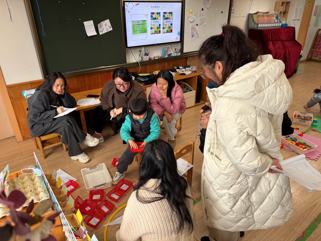 本次观摩了中一班数学区域游戏,班级内提供了不同层次、多样化的数学材料,满足了不同幼儿的发展需要。教师们聚焦数学核心经验,围绕区域活动的材料投放、幼儿游戏行为、教师支持策略等方面进行实地观摩,近距离观察了孩子们在游戏中与环境、材料、同伴的互动。