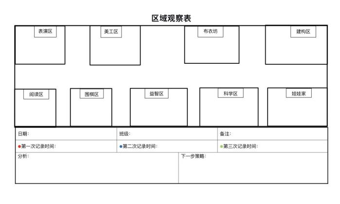 观察要求:每10分钟记录一次各个区域中幼儿的活动地点以及活动表现。分3次记录。最后6位教师将观察到的全部幼儿区域游戏情况汇总到一张总图上,使用不同颜色的线条表示幼儿活动的时间轨迹。