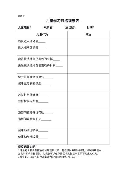 观察要求:在相应的活动区中选择1名幼儿定点观察,对符合幼儿行为的横线上打勾“✔”在评注一栏说明该行为的具体表现。