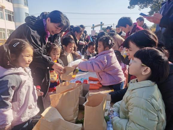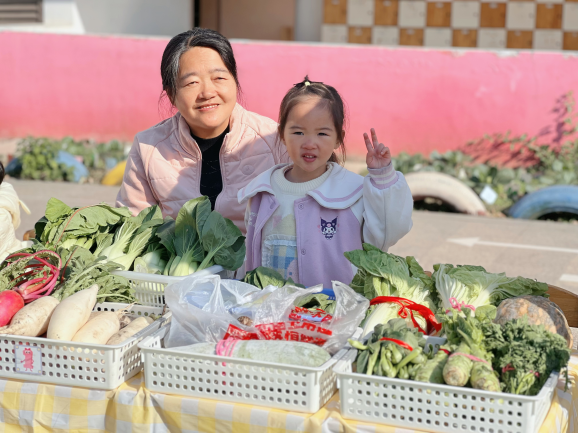 本次开放日最具特色的 “奶奶菜场”火热开市!幼儿园邀请家长志愿者带着自家种植的果蔬前来摆摊,翠绿的青菜、胖乎乎的白萝卜、圆滚滚的西红柿…… 各色果蔬整齐摆放,带着清新的田园气息,瞬间勾起了孩子们的好奇心。